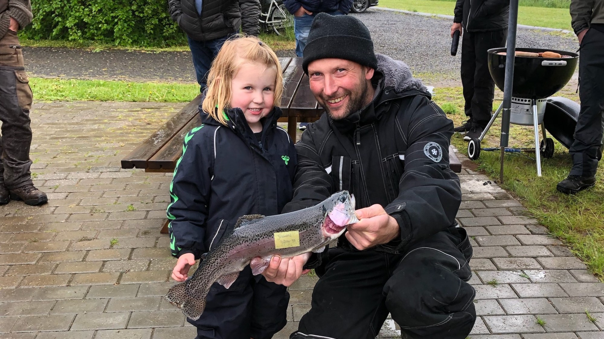 21 voksne og 8 børn trodsede regnen, og hev i alt 8 fisk på land. Til trods for kolde tæer og plaskvådt tøj, holdt de fleste fiskere ud til det sidste. Varme frankfurtere fra grillen var et must, og blev skyllet ned med øl og vand. Herunder ses de glade vindere med deres vinderfisk og fine præmier.